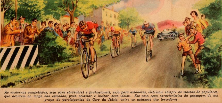 Também o movimento ciclístico está em contínua ascensão, favorecido pelo interesse das massas.  Além da Itália, também na França, Bélgica, Suíça, Holanda e em outros países, o ciclismo ocupa um lugar proeminente nas manifestações esportivas. O número de sociedades e velódromo filiados à União Ciclística Internacional, que lhes disciplina a atividade, aumenta de ano para ano, como o das competições sobre estradas e pistas.  As grandes competições em etapas, de caráter internacional (como o Giro d’Itália e o Tour de France) atraem cada vez mais a atenção e o interesse do grande público.  A técnica ciclística está em crescente progresso e as médias horárias são muito superiores às do passado.  Aqui no Brasil, a difusão desse útil esporte cresce também intensamente.  Que dizer, então, da Holanda, onde até a própria rainha se utiliza desse popular veículo e onde as bicicletas inundam as ruas e tem preferência no trânsito?  Em certas cidades da Europa, a média de difusão das bicicletas chega à beleza de uma para cada seis ou sete habitantes!  Popularismo, pois, o “cavalo de aço”.  E embora nestes últimos tempos ele esteja sofrendo forte concorrência desse outro utilíssimo aparelho que é a Lambreta, que leva grande vantagem devido ao motor, à bicicleta não se espantou e adotou da mesma forma um motor à sua propulsão e prossegue, impertérrita, em sua marcha.  E sua popularidade não será jamais ofuscada devido à sua extrema facilidade, à sua leveza, à simplicidade de suas linhas e ao pouco volume que ocupa, pois pode ser guardada em qualquer canto de sala.